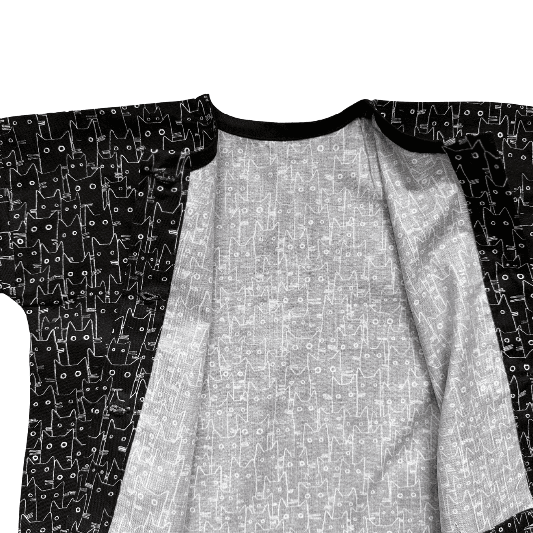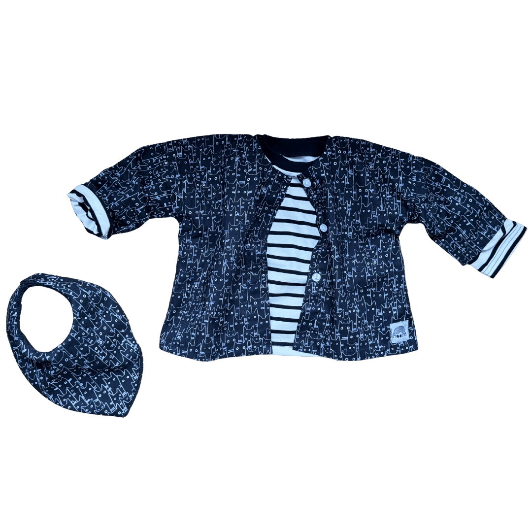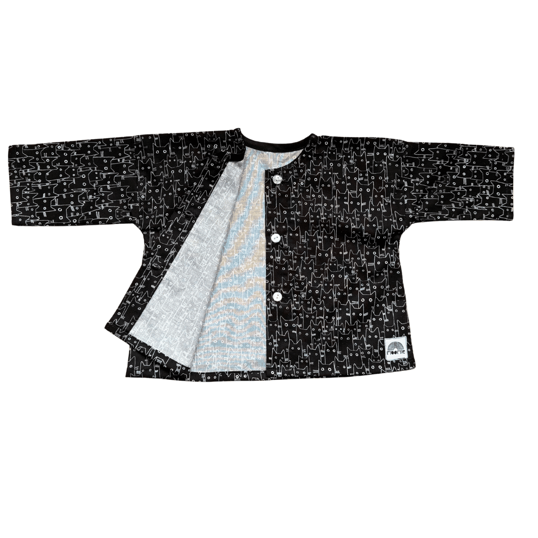 À mi-chemin entre la blouse et la veste légère, cette pièce bébé noire et blanche à imprimé chats séduit par son style graphique et minimaliste. Facile à porter au quotidien, elle apporte une touche originale tout en restant intemporelle.