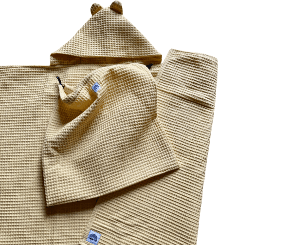 Cette cape de bain est vendue avec son pochon assorti en nid d’abeille avec un lien pour le fermer. Il pourra être utilisé pour la ranger ou pour toutes autres utilisations, notamment pour mettre les maillots de bain mouillés, le linge de sale de bébé, les produits de toilette,…