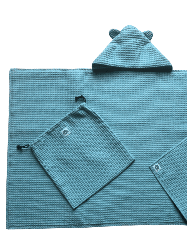 Cette cape de bain est vendue avec son pochon assorti en nid d’abeille avec un lien pour le fermer. Il pourra être utilisé pour la ranger ou pour toutes autres utilisations, notamment pour mettre les maillots de bain mouillés, le linge de sale de bébé, les produits de toilette,…