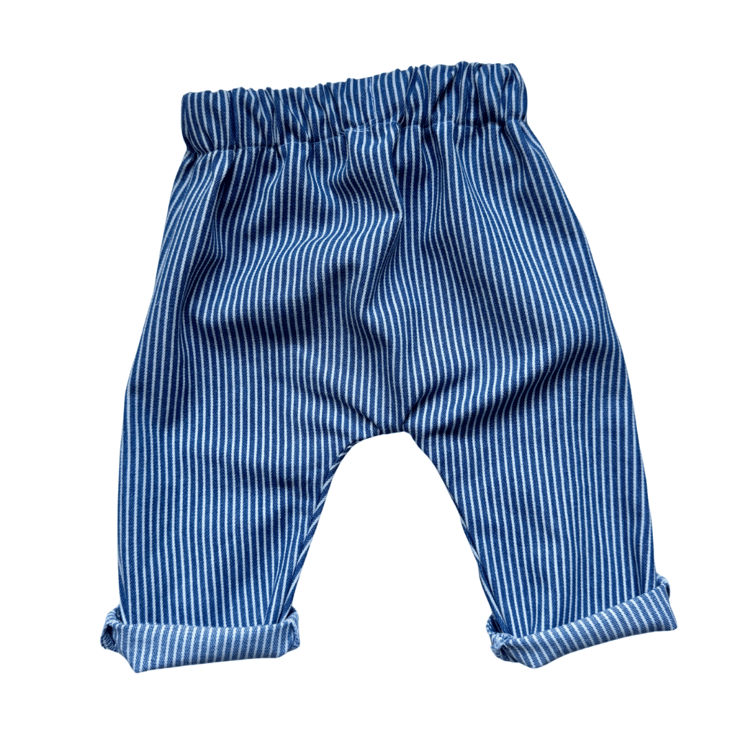 Ce pantalon bébé rayé bleu et blanc est une idée cadeau parfaite, à la fois utile, confortable et durable.